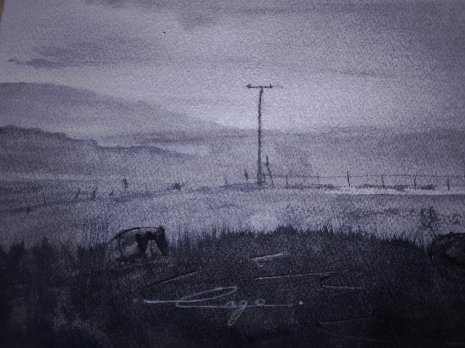 The landscape takes shape through the color itself, with each element finding its place. The final touch was the addition of the bird landing, a single moment captured in time.