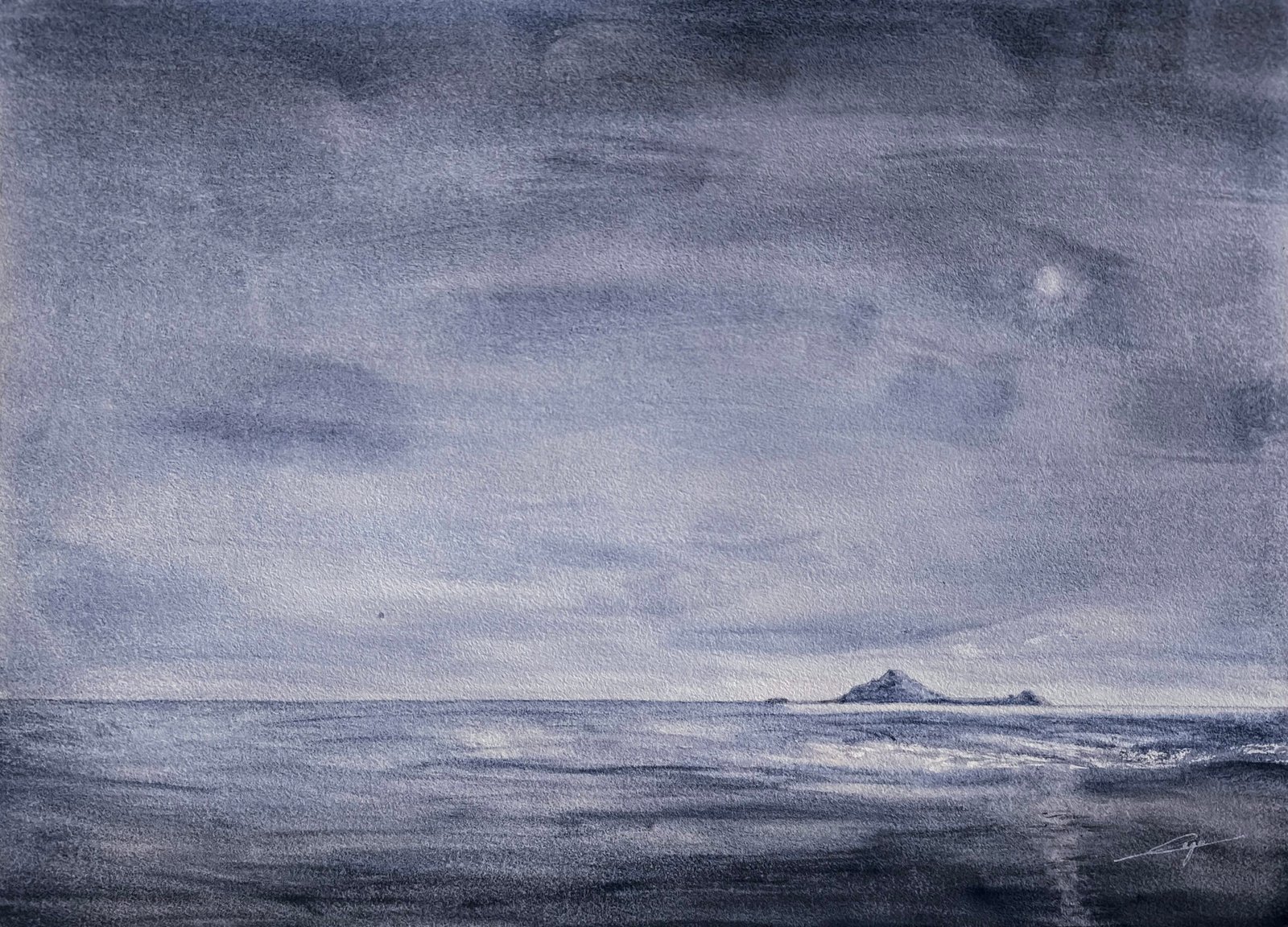 This watercolor piece explores the vastness and solitude of the seascape, rendered in a striking, near-monochromatic palette dominated by deep blues and greys.