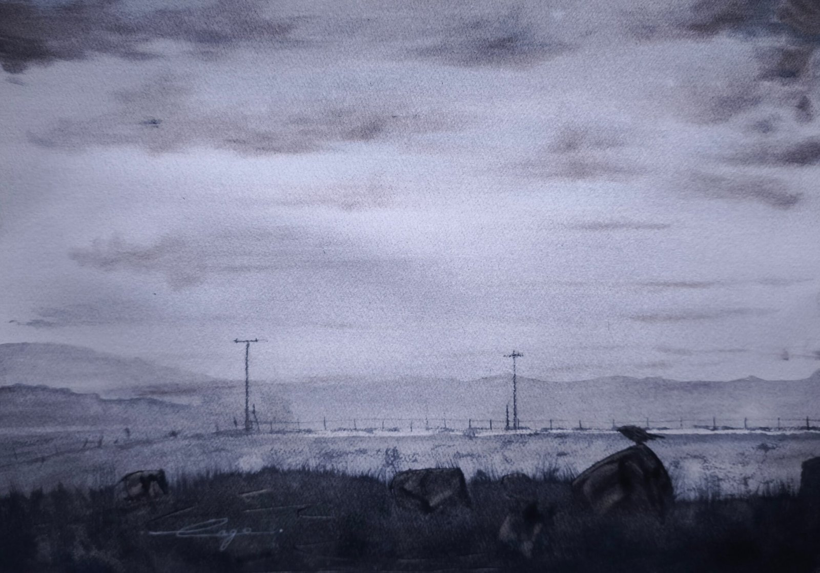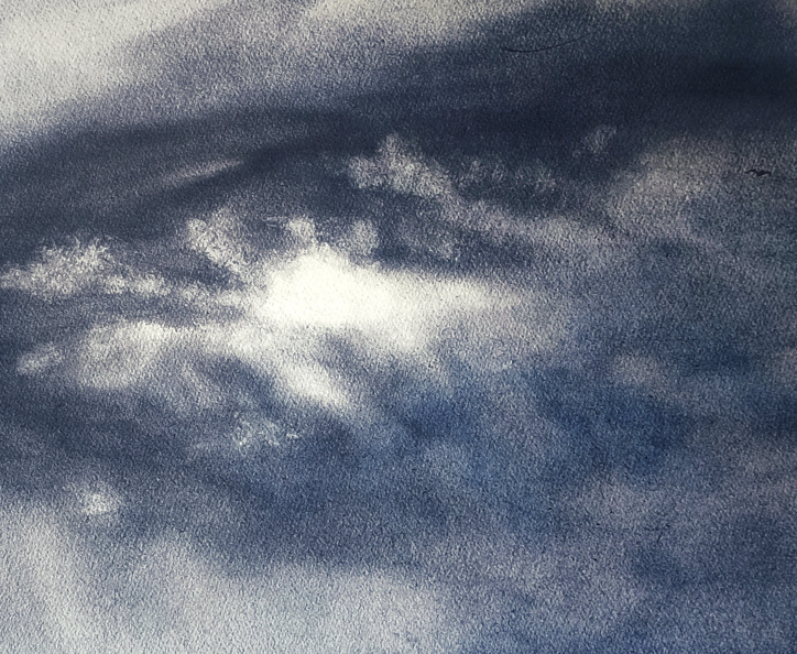 The composition is overwhelmingly dominated by a stormy sky, rendered using dense pigments to build a dark, menacing cloud mass. I focused on isolating an intense luminous opening at the center, aiming to evoke the distinctive eye of an approaching storm.