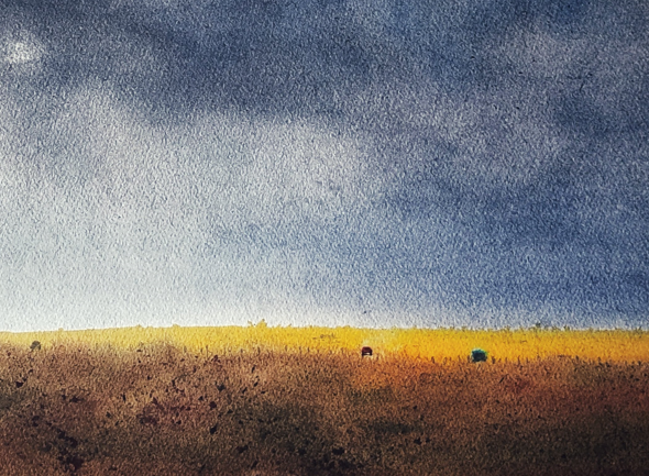 The lower plane anchors the scene, featuring an expanse of ground textured in deep, earthy tones. The horizon line is sharply delineated by a vibrant band of yellow-orange, providing a warm, bright contrast against the dark atmosphere above. The piece explores the opposition between the immense, threatening scale of the sky and the fine line of light on the land, using variations in color and pigment density to structure the landscape. This contrast highlights the raw force of nature and the fleeting moment where light meets imminent shadow.